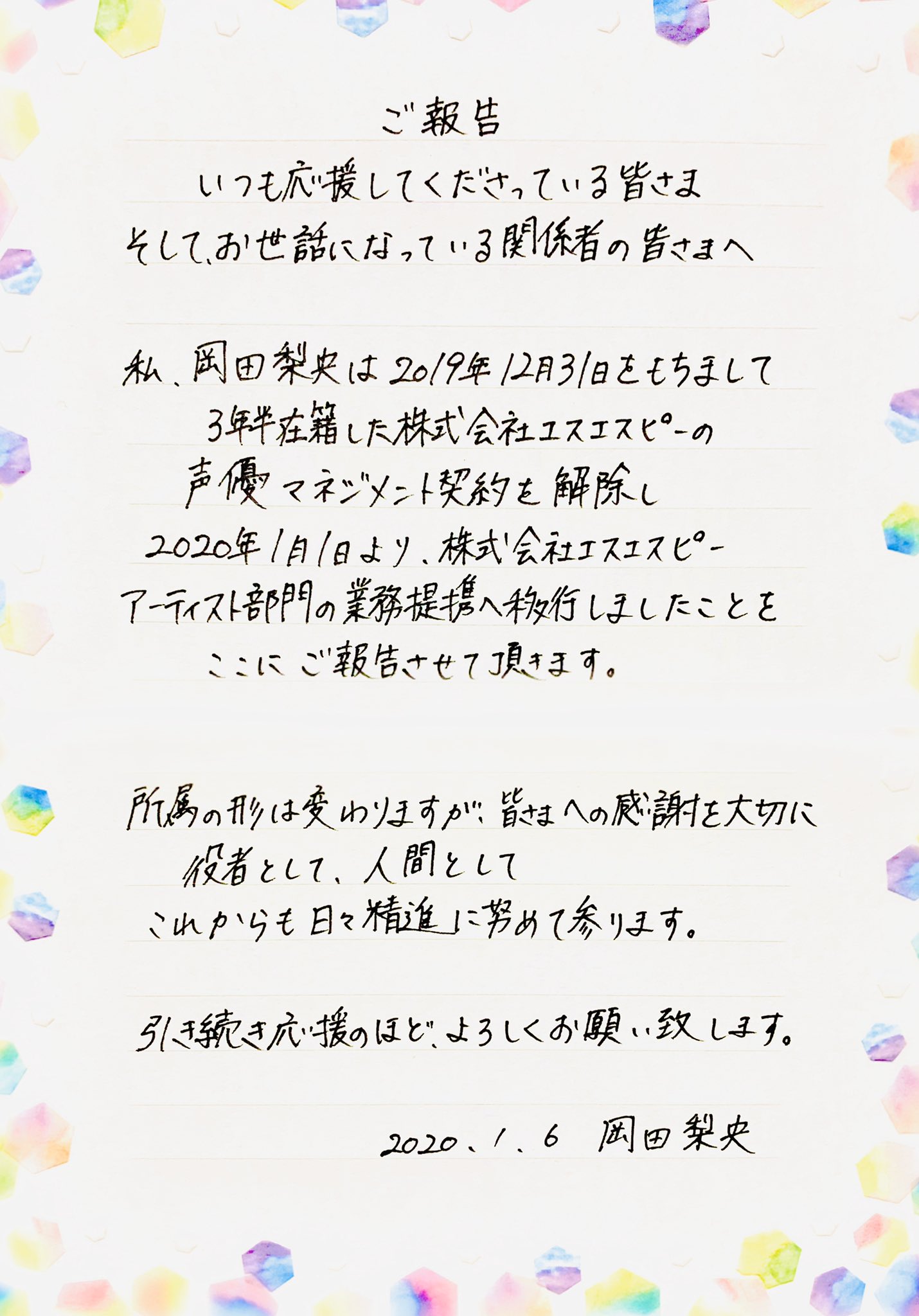 岡田 梨央 皆さまへご報告です 本年より声優 役者業はフリーランスで活動させていただく運びとなりました